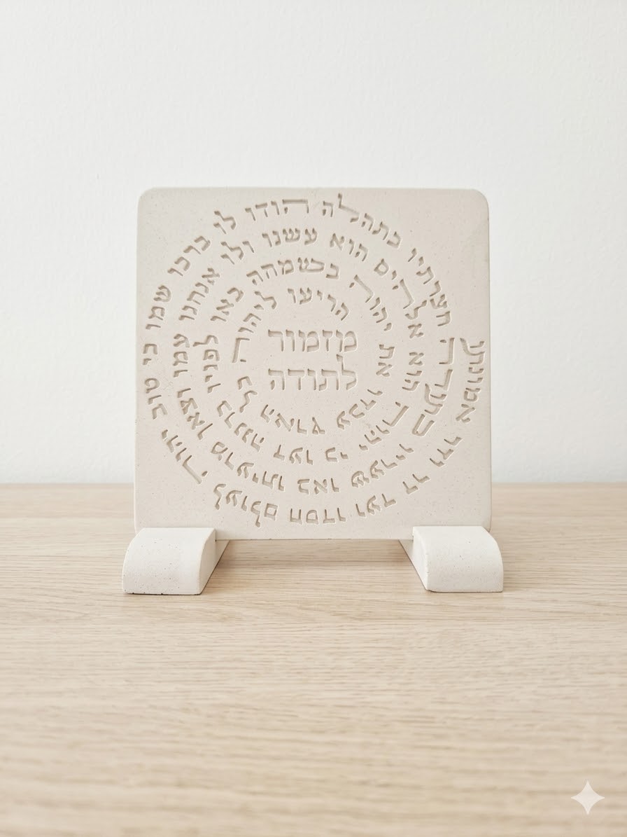 ברכת מזמור לתודה יצוקה מבטון לבן עם כיתוב ספירלי.